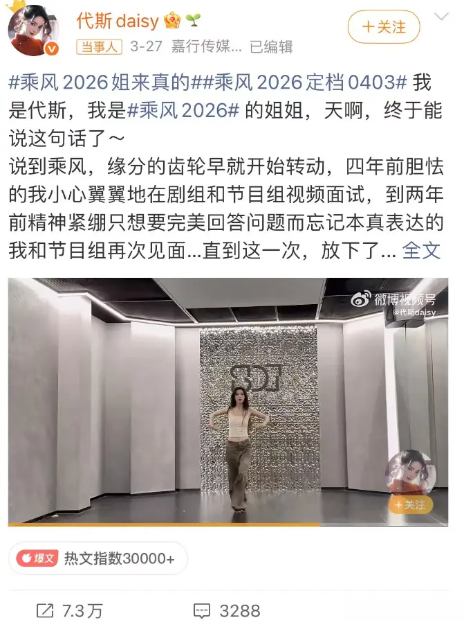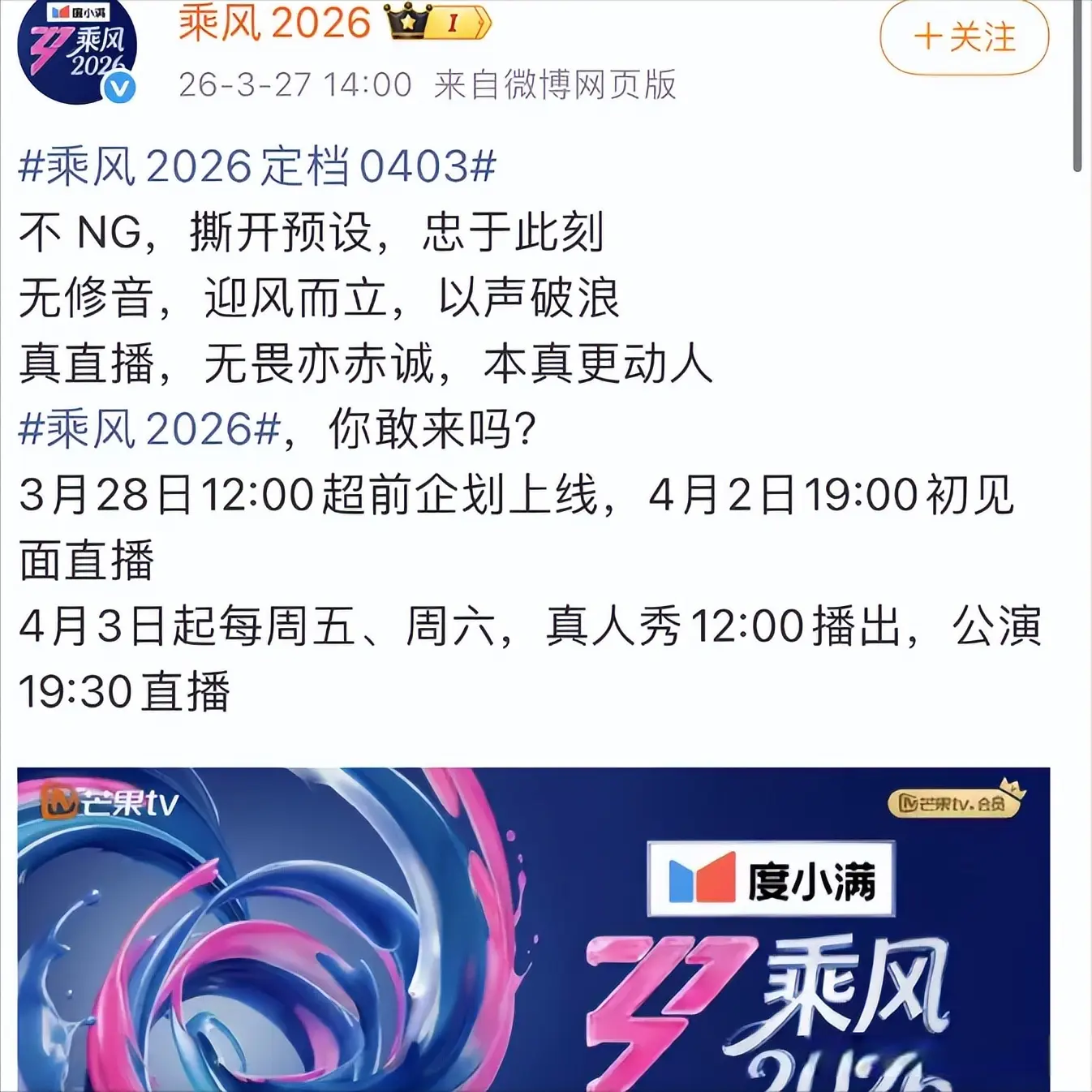 3月27日,乘风2026节目组在社媒上官宣了节目的正式上映时间,4月2日的晚上7点将会正式直播。